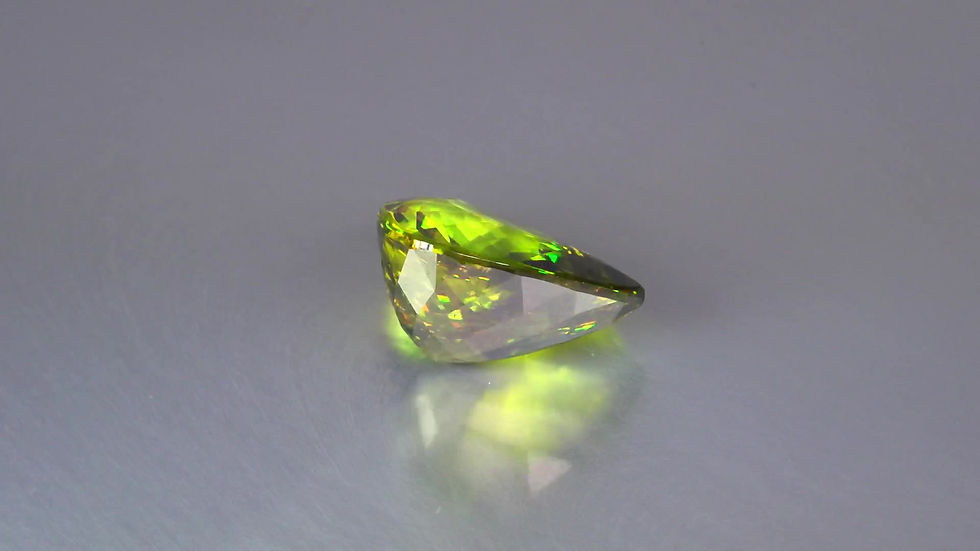 Sphene, also known as titanite, has rich body colors, strong trichroism, and a fire that exceeds diamond. Although softer than many more popular gems, sphenes can make wonderful jewelry stones if set and maintained properly.